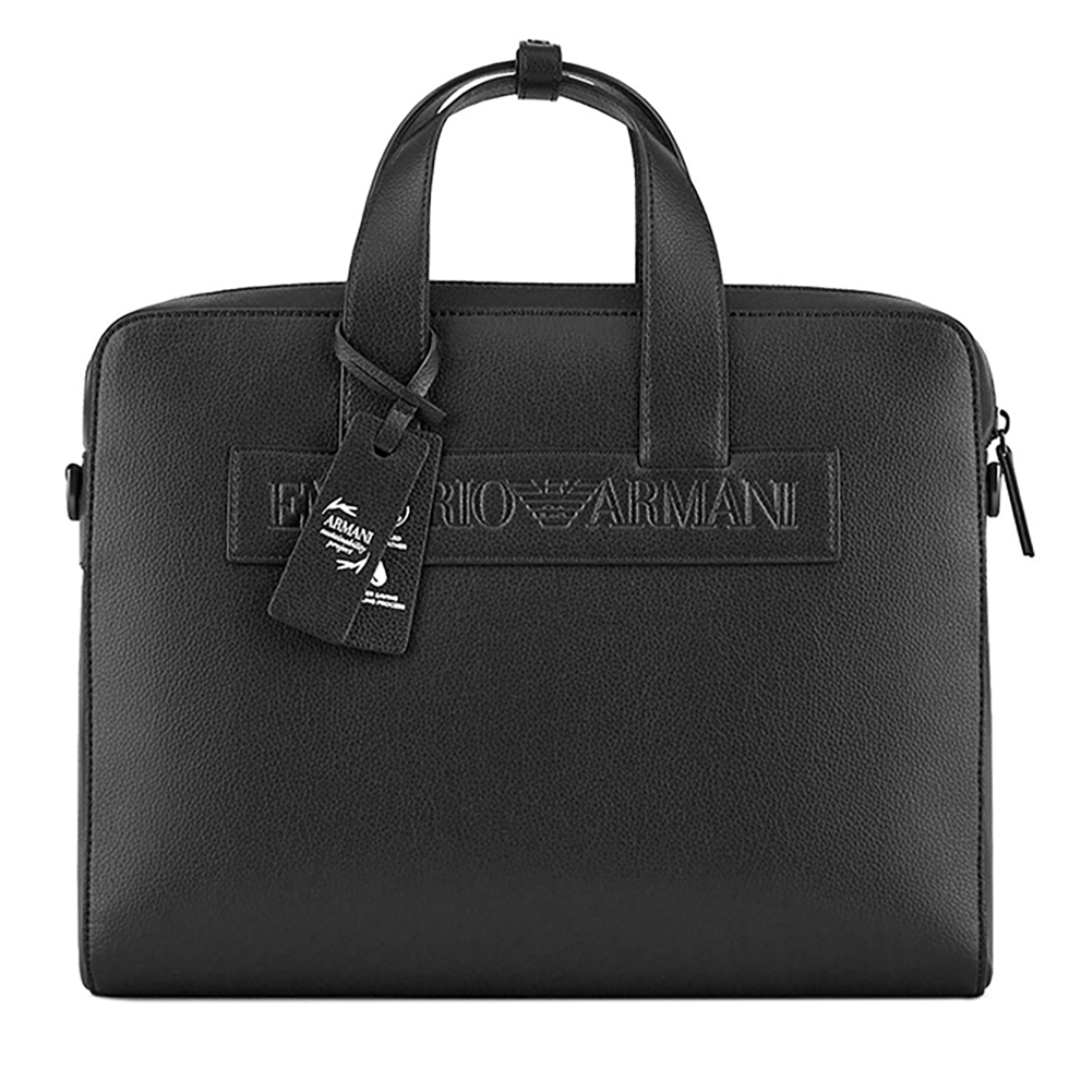 Δερμάτινος χαρτοφύλακας τσάντα χεριού Emporio Armani με ανάγλυφο λογότυπο. Διαθέτει μία κυρίως θέση για laptop ή έγγραφα και πρόσθετες θήκες οργάνωσης. Έχει χερούλια που ασφαλίζουν μεταξύ τους με κούμπωμα και λουρί ώμου. Στο μπροστινό μέρος σχηματίζεται το εμβληματικό λογότυπο του οίκου Armani.
