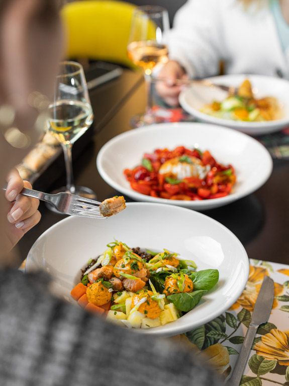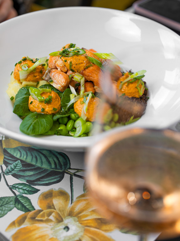 Στη συνέχεια, στο τραπέζι μας ήρθαν δύο ανατρεπτικά πιάτα, που κατάφεραν για ακόμη μία φορά να συναρπάσουν τους γευστικούς μας «κάλυκες». Πρόκειται για το Salmon Bowl, με ψητό σολομό που συνοδεύεται με γλυκοπατάτα, φακές Beluga, φασολάκια Edamame, ανανά και σάλτσα Harissa, καθώς και τα χειροποίητα μπιφτέκια γαλοπούλας με δροσερή σαλάτα από καλοκαιρινά λαχανικά.