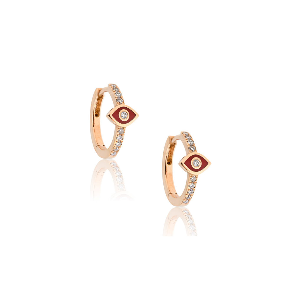 Diamond Evil Eye Huggie Earrings από ροζ χρυσό 18 καρατίων με διαμάντια και κόκκινη ρητίνη