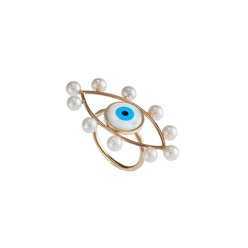 Χρυσό δαχτυλίδι με πέρλες και σχέδιο μάτι 9K