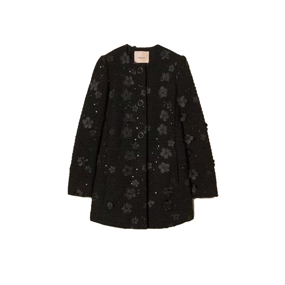 Μαύρο μπουκλέ παλτό με λουλούδια και παγιέτες