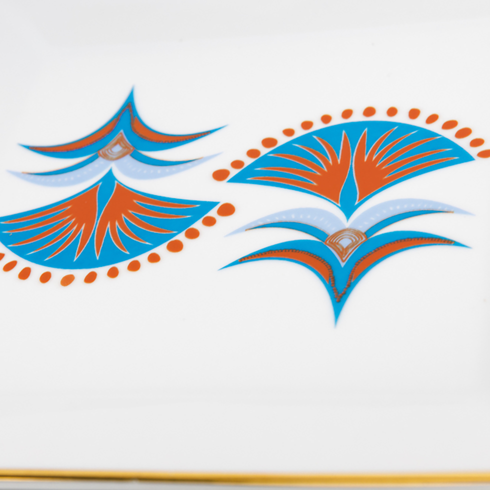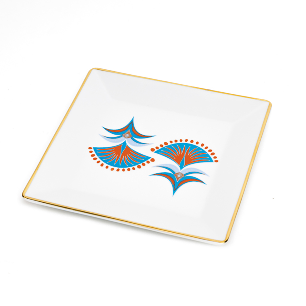 Ένα ιδιαίτερο πορσελάνινο πιάτο της δημιουργού Liana Vourakis με φολκλόρ σχέδιο και διακοσμητικό πλαίσιο.