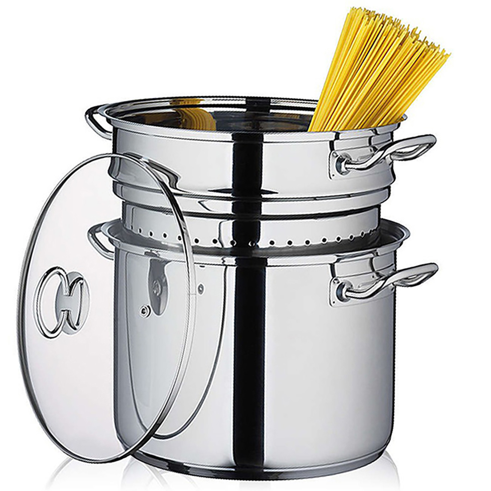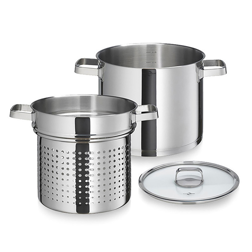 Σπαγγετιέρα με ειδικό ένθετο εξάρτημα για μαγείρεμα & στράγγισμα των ζυμαρικών. Σε γενναιόδωρο μέγεθος, είναι επίσης κατάλληλη για μεγάλες ποσότητες λαχανικών, σούπες κ.α. H βάση του σκεύους είναι κατάλληλη για μαγείρεμα σε όλες τις εστίες ακόμα και τις επαγωγικές, ενώ το γυάλινο το γυάλινο καπάκι ασφαλείας προσφέρει πλήρη εικόνα κατά τη διάρκεια του μαγειρέματος. Από ανοξείδωτο ατσάλι.